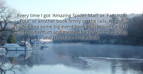 Straczynski, J. Michael. (2026, January 16). Every time I got 'Amazing Spider-Man' or 'Fantastic Four' or another book firmly on the rails, we got pulled into some big event book or crossover and it cost momentum and messed badly with the pacing and structure of the book. FixQuotes. https://fixquotes.com/quotes/every-time-i-got-amazing-spider-man-or-fantastic-91098/