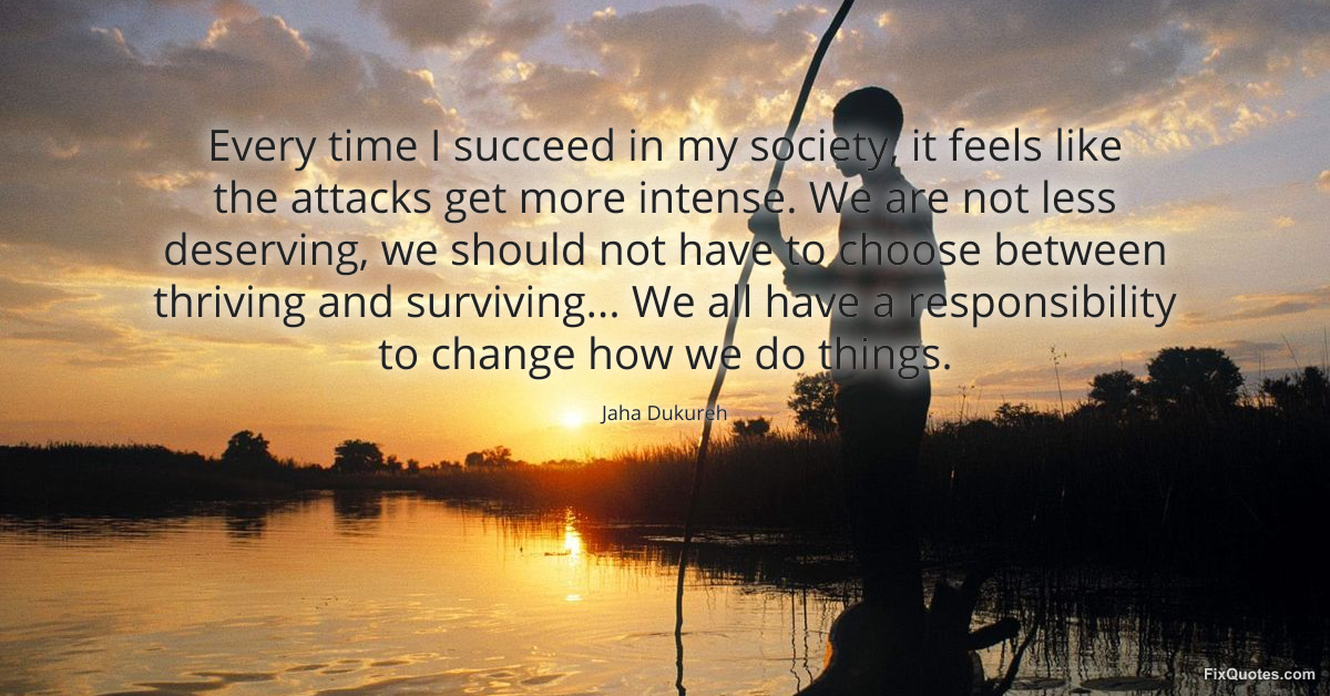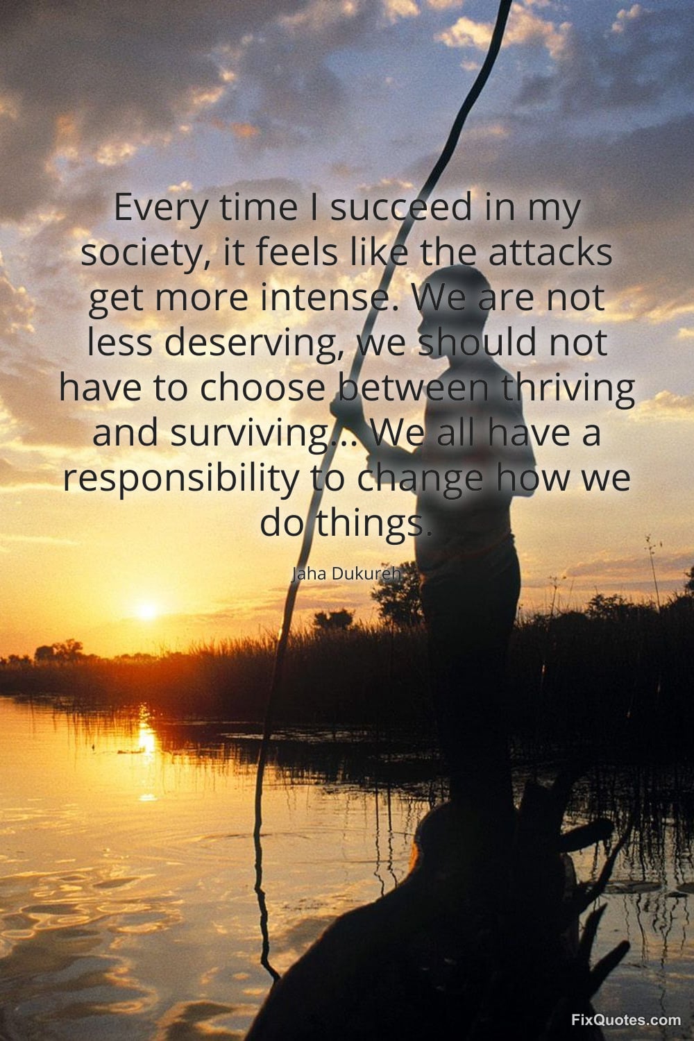 Dukureh, Jaha. (2026, February 17). Every time I succeed in my society, it feels like the attacks get more intense. We are not less deserving, we should not have to choose between thriving and surviving... We all have a responsibility to change how we do things. FixQuotes. https://fixquotes.com/quotes/every-time-i-succeed-in-my-society-it-feels-like-185616/
