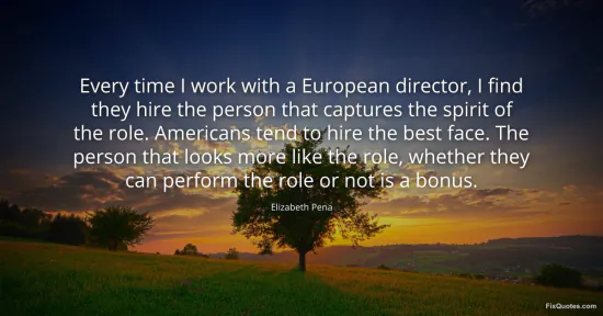 Pena, Elizabeth. (2026, January 17). Every time I work with a European director, I find they hire the person that captures the spirit of the role. Americans tend to hire the best face. The person that looks more like the role, whether they can perform the role or not is a bonus. FixQuotes. https://fixquotes.com/quotes/every-time-i-work-with-a-european-director-i-find-53559/