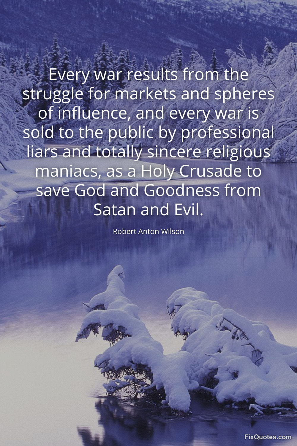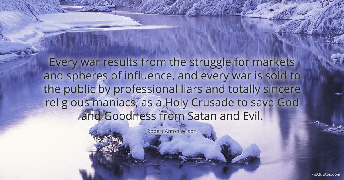 Wilson, Robert Anton. "Every war results from the struggle for markets and spheres of influence, and every war is sold to the public by professional liars and totally sincere religious maniacs, as a Holy Crusade to save God and Goodness from Satan and Evil." FixQuotes. January 16, 2026. https://fixquotes.com/quotes/every-war-results-from-the-struggle-for-markets-94802/.