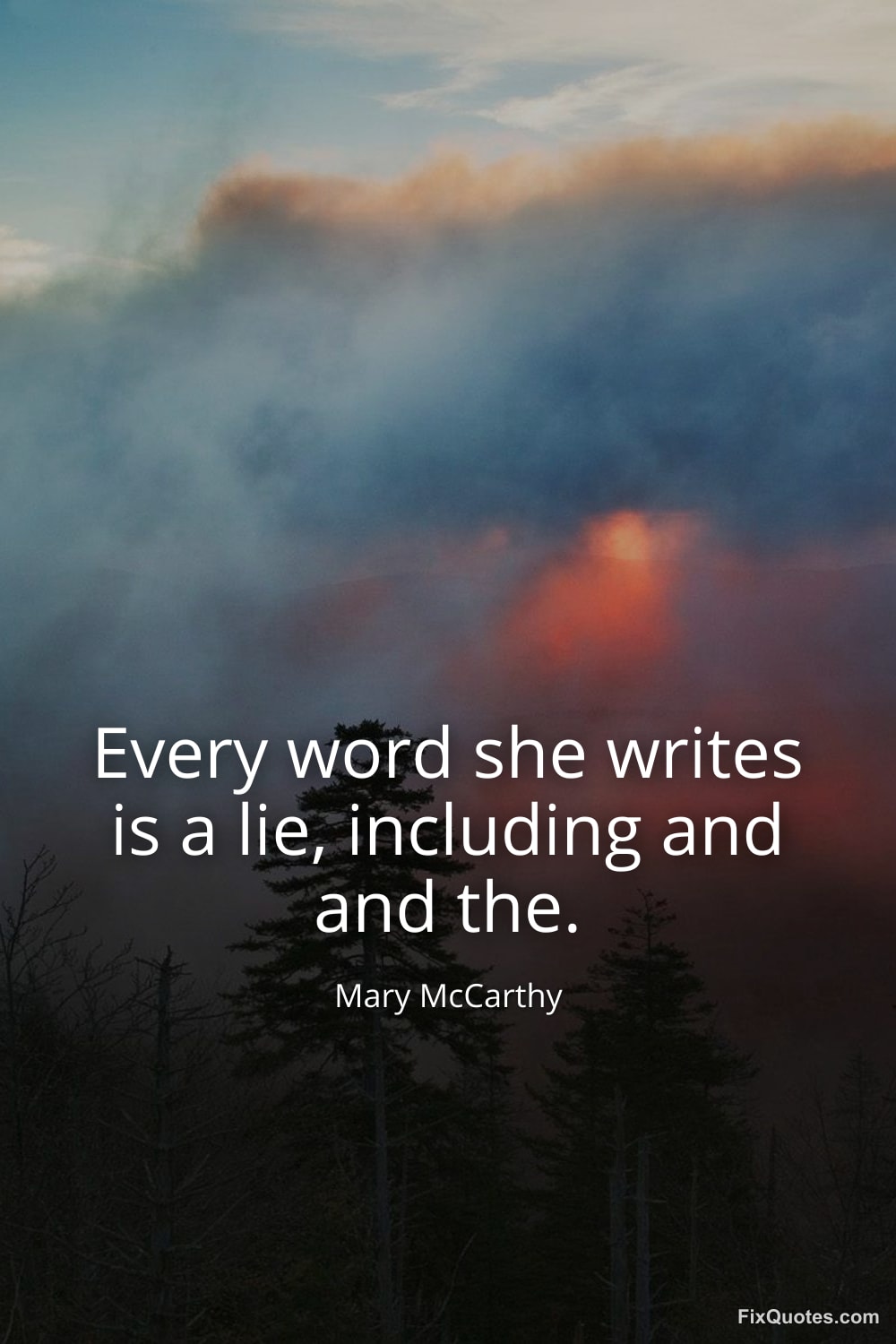 McCarthy, Mary. (2026, January 17). Every word she writes is a lie, including and and the. FixQuotes. https://fixquotes.com/quotes/every-word-she-writes-is-a-lie-including-and-and-73417/