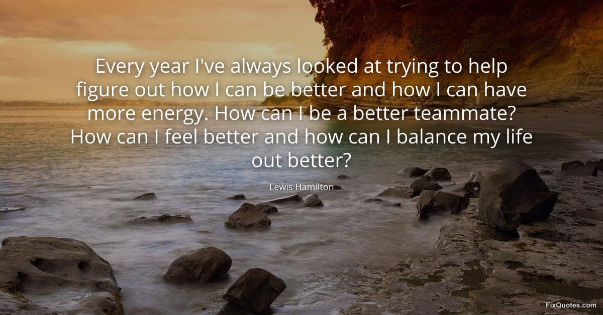Hamilton, Lewis. (2026, March 17). Every year I've always looked at trying to help figure out how I can be better and how I can have more energy. How can I be a better teammate? How can I feel better and how can I balance my life out better? FixQuotes. https://fixquotes.com/quotes/every-year-ive-always-looked-at-trying-to-help-186121/