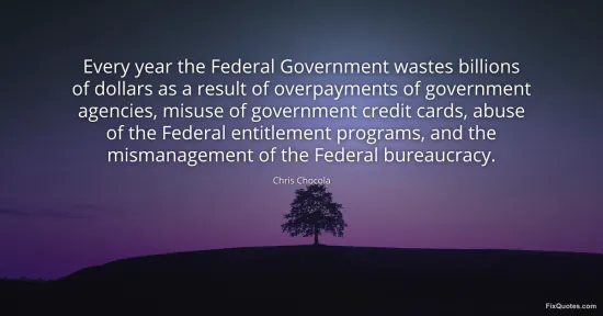 Chocola, Chris. (2026, January 17). Every year the Federal Government wastes billions of dollars as a result of overpayments of government agencies, misuse of government credit cards, abuse of the Federal entitlement programs, and the mismanagement of the Federal bureaucracy. FixQuotes. https://fixquotes.com/quotes/every-year-the-federal-government-wastes-billions-46330/