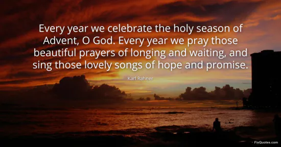 Rahner, Karl. (2026, January 14). Every year we celebrate the holy season of Advent, O God. Every year we pray those beautiful prayers of longing and waiting, and sing those lovely songs of hope and promise. FixQuotes. https://fixquotes.com/quotes/every-year-we-celebrate-the-holy-season-of-advent-3066/