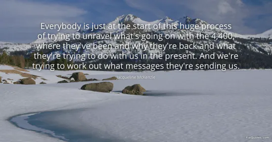 McKenzie, Jacqueline. "Everybody is just at the start of this huge process of trying to unravel what's going on with the 4,400, where they've been and why they're back and what they're trying to do with us in the present. And we're trying to work out what messages they're sending us." FixQuotes. January 17, 2026. https://fixquotes.com/quotes/everybody-is-just-at-the-start-of-this-huge-68379/.