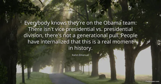 Emanuel, Rahm. (2026, January 16). Everybody knows they're on the Obama team: There isn't vice presidential vs. presidential division, there's not a generational pull. People have internalized that this is a real moment in history. FixQuotes. https://fixquotes.com/quotes/everybody-knows-theyre-on-the-obama-team-there-121067/