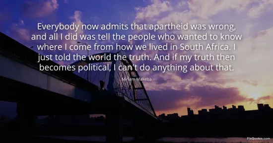 Makeba, Miriam. (2026, January 15). Everybody now admits that apartheid was wrong, and all I did was tell the people who wanted to know where I come from how we lived in South Africa. I just told the world the truth. And if my truth then becomes political, I can't do anything about that. FixQuotes. https://fixquotes.com/quotes/everybody-now-admits-that-apartheid-was-wrong-and-105352/