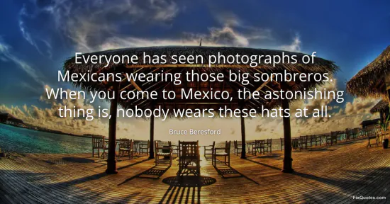 Beresford, Bruce. (2026, January 17). Everyone has seen photographs of Mexicans wearing those big sombreros. When you come to Mexico, the astonishing thing is, nobody wears these hats at all. FixQuotes. https://fixquotes.com/quotes/everyone-has-seen-photographs-of-mexicans-wearing-42294/