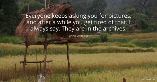 Leibovitz, Annie. "Everyone keeps asking you for pictures, and after a while you get tired of that. I always say, They are in the archives." FixQuotes. January 18, 2026. https://fixquotes.com/quotes/everyone-keeps-asking-you-for-pictures-and-after-4032/.