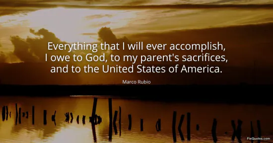 Rubio, Marco. "Everything that I will ever accomplish, I owe to God, to my parent's sacrifices, and to the United States of America." FixQuotes. January 16, 2026. https://fixquotes.com/quotes/everything-that-i-will-ever-accomplish-i-owe-to-114965/.