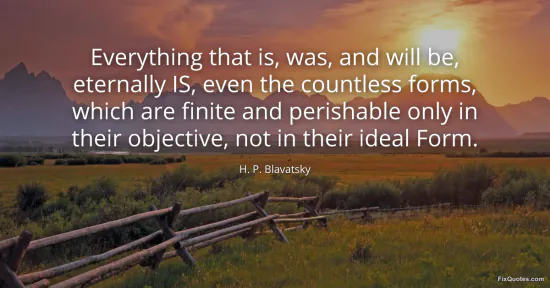 Blavatsky, H. P. (2026, January 15). Everything that is, was, and will be, eternally IS, even the countless forms, which are finite and perishable only in their objective, not in their ideal Form. FixQuotes. https://fixquotes.com/quotes/everything-that-is-was-and-will-be-eternally-is-148494/