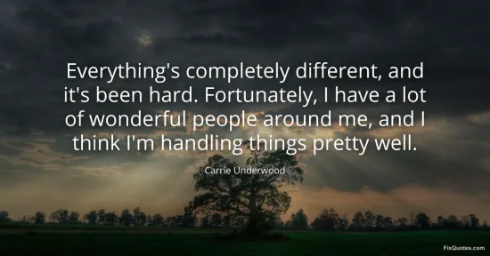 Underwood, Carrie. "Everything's completely different, and it's been hard. Fortunately, I have a lot of wonderful people around me, and I think I'm handling things pretty well." FixQuotes. January 16, 2026. https://fixquotes.com/quotes/everythings-completely-different-and-its-been-109682/.