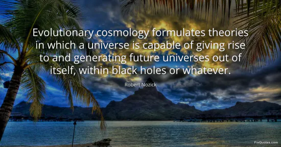 Nozick, Robert. "Evolutionary cosmology formulates theories in which a universe is capable of giving rise to and generating future universes out of itself, within black holes or whatever." FixQuotes. January 16, 2026. https://fixquotes.com/quotes/evolutionary-cosmology-formulates-theories-in-106683/.