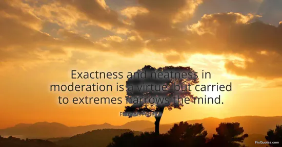 "Exactness and neatness in moderation is a virtue, but carried to extremes narrows the mind." FixQuotes, 16 Jan. 2026, https://fixquotes.com/quotes/exactness-and-neatness-in-moderation-is-a-virtue-95357/. Accessed 12 Feb. 2026.
