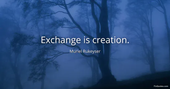 Muriel Rukeyser’s “Exchange is creation” reads like a manifesto smuggled into five syllables. It rejects the romantic myth of the solitary genius and insists that making art is less a private miracle than a social transaction: voices meeting, ideas rubbing up against each other, material and meaning moving hand to hand. “Exchange” is a deliberately unglamorous word. It evokes labor, markets, conversation, translation, even bargaining. Pairing it with “creation” collapses the distance between the everyday and the sublime, arguing that the conditions we tend to treat as contamination of art - influence, collaboration, audience, politics - are the engine of it.