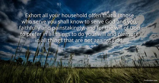 Grosseteste, Robert. (2026, January 17). Exhort all your household often that all those who serve you shall know to serve God and you, faithfully and painstakingly, and for the will of God to prefer in all things to do your will and pleasure in all things that are not against God. FixQuotes. https://fixquotes.com/quotes/exhort-all-your-household-often-that-all-those-27881/