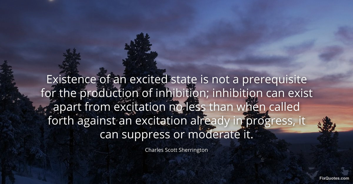 Sherrington, Charles Scott. "Existence of an excited state is not a prerequisite for the production of inhibition; inhibition can exist apart from excitation no less than when called forth against an excitation already in progress, it can suppress or moderate it." FixQuotes. February 16, 2026. https://fixquotes.com/quotes/existence-of-an-excited-state-is-not-a-120250/.