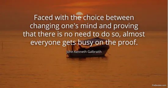 Galbraith, John Kenneth. (2026, January 15). Faced with the choice between changing one's mind and proving that there is no need to do so, almost everyone gets busy on the proof. FixQuotes. https://fixquotes.com/quotes/faced-with-the-choice-between-changing-ones-mind-3041/