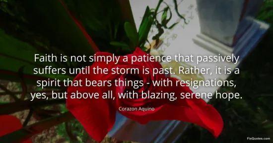 Aquino, Corazon. (2026, January 17). Faith is not simply a patience that passively suffers until the storm is past. Rather, it is a spirit that bears things - with resignations, yes, but above all, with blazing, serene hope. FixQuotes. https://fixquotes.com/quotes/faith-is-not-simply-a-patience-that-passively-43096/