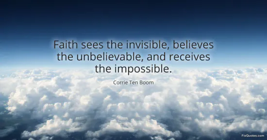 Boom, Corrie Ten. (2026, January 14). Faith sees the invisible, believes the unbelievable, and receives the impossible. FixQuotes. https://fixquotes.com/quotes/faith-sees-the-invisible-believes-the-172854/