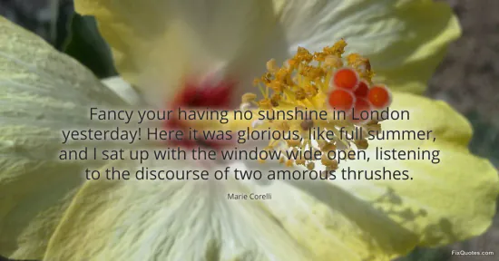 Corelli, Marie. (2026, January 16). Fancy your having no sunshine in London yesterday! Here it was glorious, like full summer, and I sat up with the window wide open, listening to the discourse of two amorous thrushes. FixQuotes. https://fixquotes.com/quotes/fancy-your-having-no-sunshine-in-london-yesterday-112469/