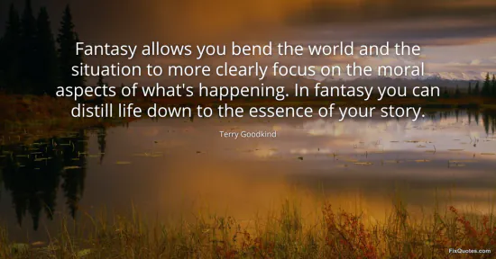 Goodkind, Terry. "Fantasy allows you bend the world and the situation to more clearly focus on the moral aspects of what's happening. In fantasy you can distill life down to the essence of your story." FixQuotes. January 16, 2026. https://fixquotes.com/quotes/fantasy-allows-you-bend-the-world-and-the-107407/.