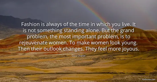Chanel, Coco. (2026, January 17). Fashion is always of the time in which you live. It is not something standing alone. But the grand problem, the most important problem, is to rejeuvenate women. To make women look young. Then their outlook changes. They feel more joyous. FixQuotes. https://fixquotes.com/quotes/fashion-is-always-of-the-time-in-which-you-live-30630/