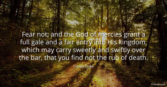 Cargill, Donald. (2026, January 17). Fear not; and the God of mercies grant a full gale and a fair entry into His kingdom, which may carry sweetly and swiftly over the bar, that you find not the rub of death. FixQuotes. https://fixquotes.com/quotes/fear-not-and-the-god-of-mercies-grant-a-full-gale-81897/