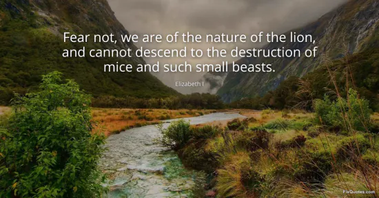 I, Elizabeth. (2026, January 18). Fear not, we are of the nature of the lion, and cannot descend to the destruction of mice and such small beasts. FixQuotes. https://fixquotes.com/quotes/fear-not-we-are-of-the-nature-of-the-lion-and-5437/