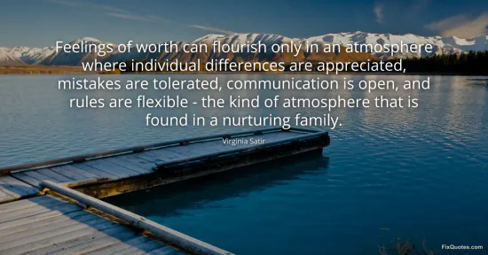 Satir, Virginia. (2026, March 2). Feelings of worth can flourish only in an atmosphere where individual differences are appreciated, mistakes are tolerated, communication is open, and rules are flexible - the kind of atmosphere that is found in a nurturing family. FixQuotes. https://fixquotes.com/quotes/feelings-of-worth-can-flourish-only-in-an-2951/
