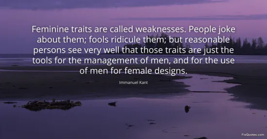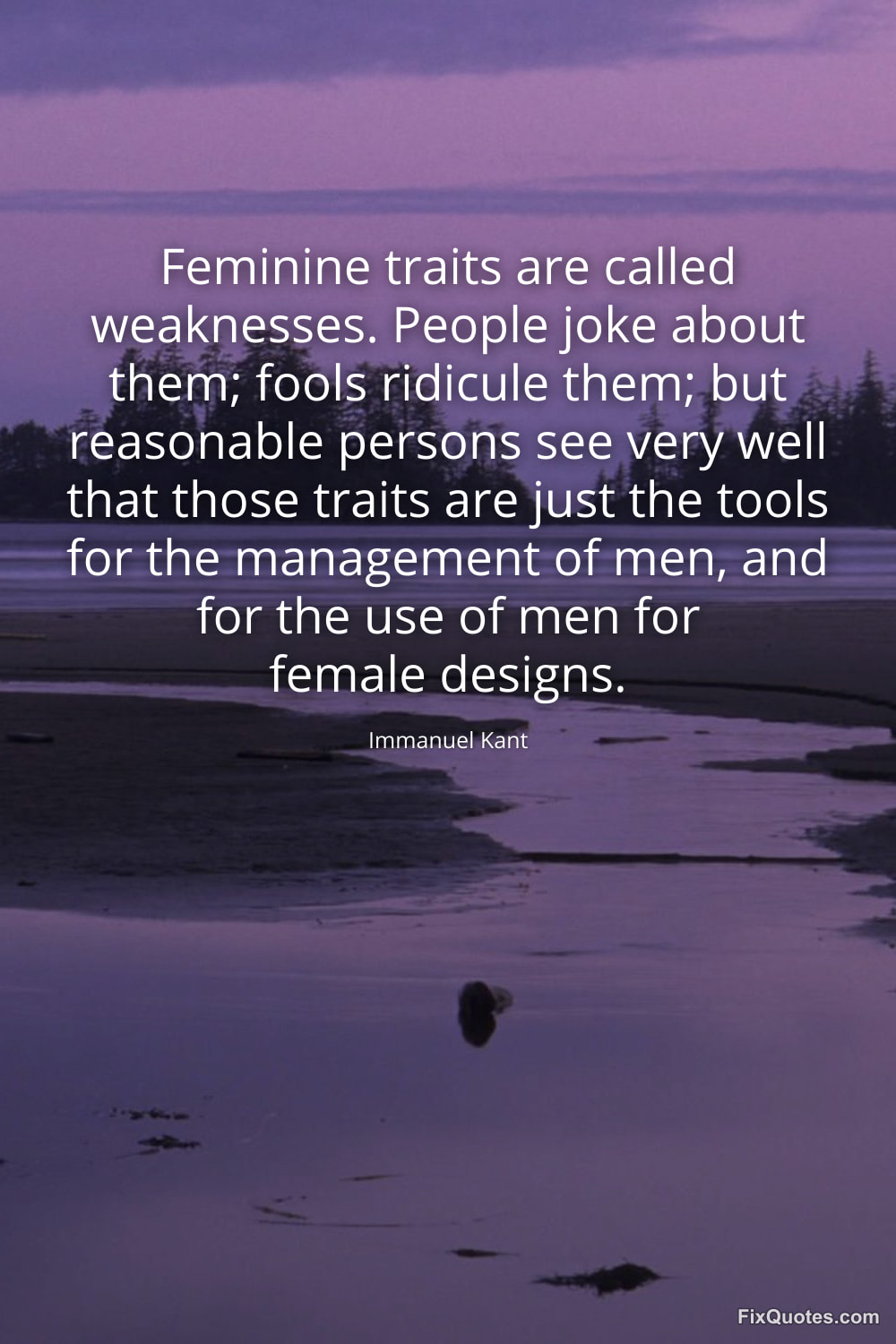 Kant, Immanuel. "Feminine traits are called weaknesses. People joke about them; fools ridicule them; but reasonable persons see very well that those traits are just the tools for the management of men, and for the use of men for female designs." FixQuotes. February 10, 2026. https://fixquotes.com/quotes/feminine-traits-are-called-weaknesses-people-joke-185065/.