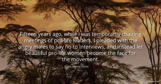 Olasky, Marvin. "Fifteen years ago, while I was temporarily chairing meetings of pro-life leaders, I pleaded with the angry males to say no to interviews, and instead let beautiful pro-life women become the face for the movement." FixQuotes. Accessed February 1, 2026. https://fixquotes.com/quotes/fifteen-years-ago-while-i-was-temporarily-100184/.