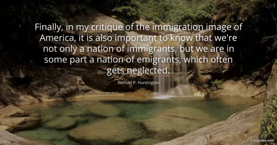 Huntington, Samuel P. "Finally, in my critique of the immigration image of America, it is also important to know that we're not only a nation of immigrants, but we are in some part a nation of emigrants, which often gets neglected." FixQuotes. January 18, 2026. https://fixquotes.com/quotes/finally-in-my-critique-of-the-immigration-image-21544/.