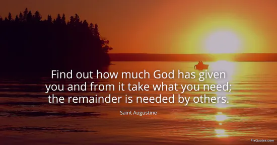 Augustine, Saint. "Find out how much God has given you and from it take what you need; the remainder is needed by others." FixQuotes. January 15, 2026. https://fixquotes.com/quotes/find-out-how-much-god-has-given-you-and-from-it-1636/.
