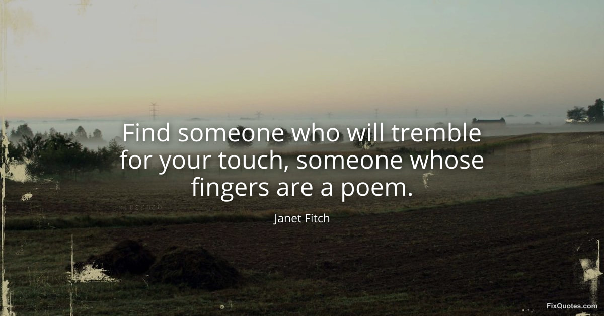 Fitch, Janet. (2026, January 11). Find someone who will tremble for your touch, someone whose fingers are a poem. FixQuotes. https://fixquotes.com/quotes/find-someone-who-will-tremble-for-your-touch-183838/