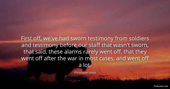 Shays, Christopher. "First off, we've had sworn testimony from soldiers and testimony before our staff that wasn't sworn, that said, these alarms rarely went off, that they went off after the war in most cases, and went off a lot." FixQuotes. February 19, 2026. https://fixquotes.com/quotes/first-off-weve-had-sworn-testimony-from-soldiers-47236/.