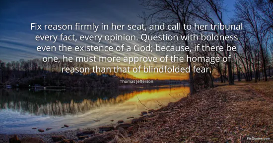 Jefferson, Thomas. (2026, February 16). Fix reason firmly in her seat, and call to her tribunal every fact, every opinion. Question with boldness even the existence of a God; because, if there be one, he must more approve of the homage of reason than that of blindfolded fear. FixQuotes. https://fixquotes.com/quotes/fix-reason-firmly-in-her-seat-and-call-to-her-137791/