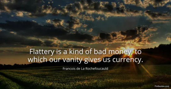 Rochefoucauld, Francois de La. "Flattery is a kind of bad money, to which our vanity gives us currency." FixQuotes. January 18, 2026. https://fixquotes.com/quotes/flattery-is-a-kind-of-bad-money-to-which-our-13070/.