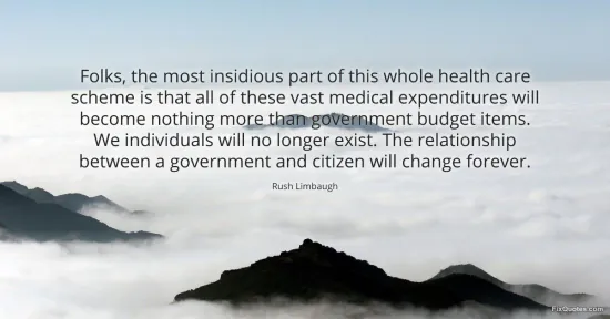 Limbaugh, Rush. (2026, January 18). Folks, the most insidious part of this whole health care scheme is that all of these vast medical expenditures will become nothing more than government budget items. We individuals will no longer exist. The relationship between a government and citizen will change forever. FixQuotes. https://fixquotes.com/quotes/folks-the-most-insidious-part-of-this-whole-19067/