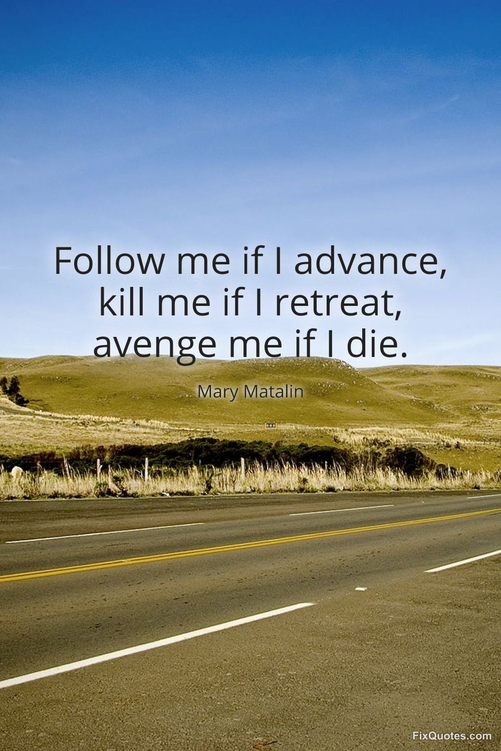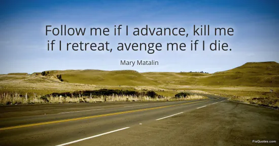 Matalin, Mary. "Follow me if I advance, kill me if I retreat, avenge me if I die." FixQuotes. January 16, 2026. https://fixquotes.com/quotes/follow-me-if-i-advance-kill-me-if-i-retreat-104537/.