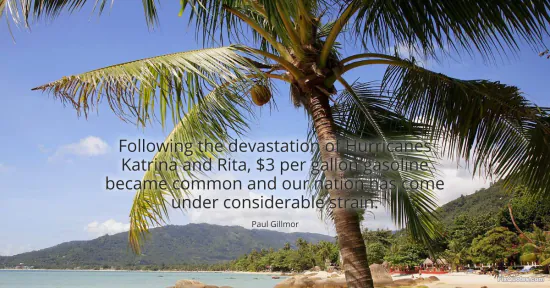 Gillmor, Paul. "Following the devastation of Hurricanes Katrina and Rita, $3 per gallon gasoline became common and our nation has come under considerable strain." FixQuotes. January 16, 2026. https://fixquotes.com/quotes/following-the-devastation-of-hurricanes-katrina-82484/.