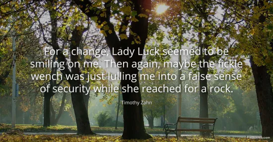 Zahn, Timothy. (2026, February 18). For a change, Lady Luck seemed to be smiling on me. Then again, maybe the fickle wench was just lulling me into a false sense of security while she reached for a rock. FixQuotes. https://fixquotes.com/quotes/for-a-change-lady-luck-seemed-to-be-smiling-on-me-84765/