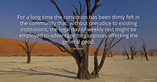 Adler, Felix. "For a long time the conviction has been dimly felt in the community that, without prejudice to existing institutions, the legal day of weekly rest might be employed to advantage for purposes affecting the general good." FixQuotes. February 18, 2026. https://fixquotes.com/quotes/for-a-long-time-the-conviction-has-been-dimly-59163/.
