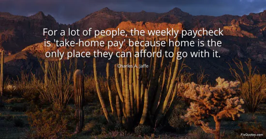 Jaffe, Charles A. "For a lot of people, the weekly paycheck is 'take-home pay' because home is the only place they can afford to go with it." FixQuotes. January 14, 2026. https://fixquotes.com/quotes/for-a-lot-of-people-the-weekly-paycheck-is-141894/.