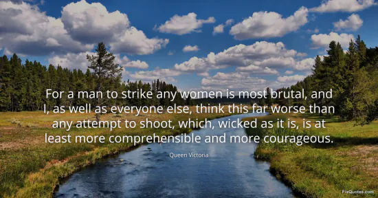 Victoria, Queen. (2026, January 15). For a man to strike any women is most brutal, and I, as well as everyone else, think this far worse than any attempt to shoot, which, wicked as it is, is at least more comprehensible and more courageous. FixQuotes. https://fixquotes.com/quotes/for-a-man-to-strike-any-women-is-most-brutal-and-15470/