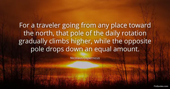 Copernicus, Nicolaus. "For a traveler going from any place toward the north, that pole of the daily rotation gradually climbs higher, while the opposite pole drops down an equal amount." FixQuotes. January 18, 2026. https://fixquotes.com/quotes/for-a-traveler-going-from-any-place-toward-the-3083/.