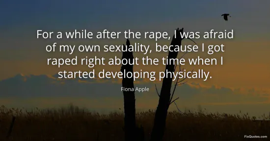 Apple, Fiona. "For a while after the rape, I was afraid of my own sexuality, because I got raped right about the time when I started developing physically." FixQuotes. January 16, 2026. https://fixquotes.com/quotes/for-a-while-after-the-rape-i-was-afraid-of-my-own-84071/.