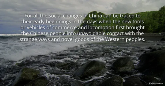 Shih, Hu. (2026, January 18). For all the social changes in China can be traced to their early beginnings in the days when the new tools or vehicles of commerce and locomotion first brought the Chinese people into unavoidable contact with the strange ways and novel goods of the Western peoples. FixQuotes. https://fixquotes.com/quotes/for-all-the-social-changes-in-china-can-be-traced-188/