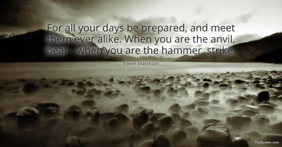 Markham, Edwin. "For all your days be prepared, and meet them ever alike. When you are the anvil, bear - when you are the hammer, strike." FixQuotes. January 17, 2026. https://fixquotes.com/quotes/for-all-your-days-be-prepared-and-meet-them-ever-74320/.