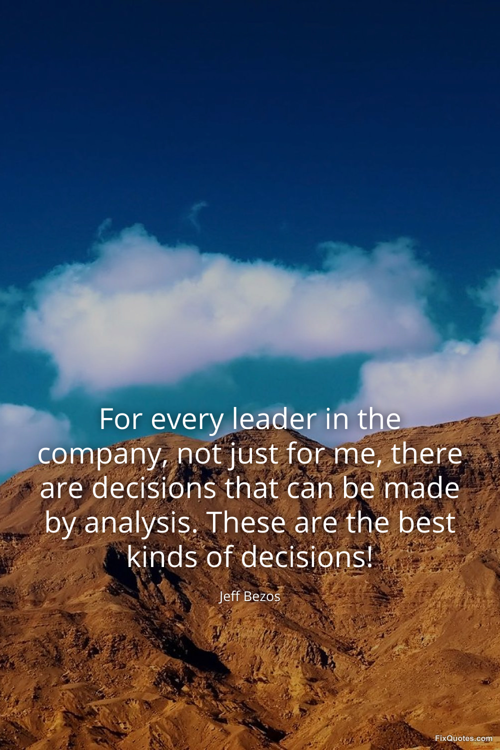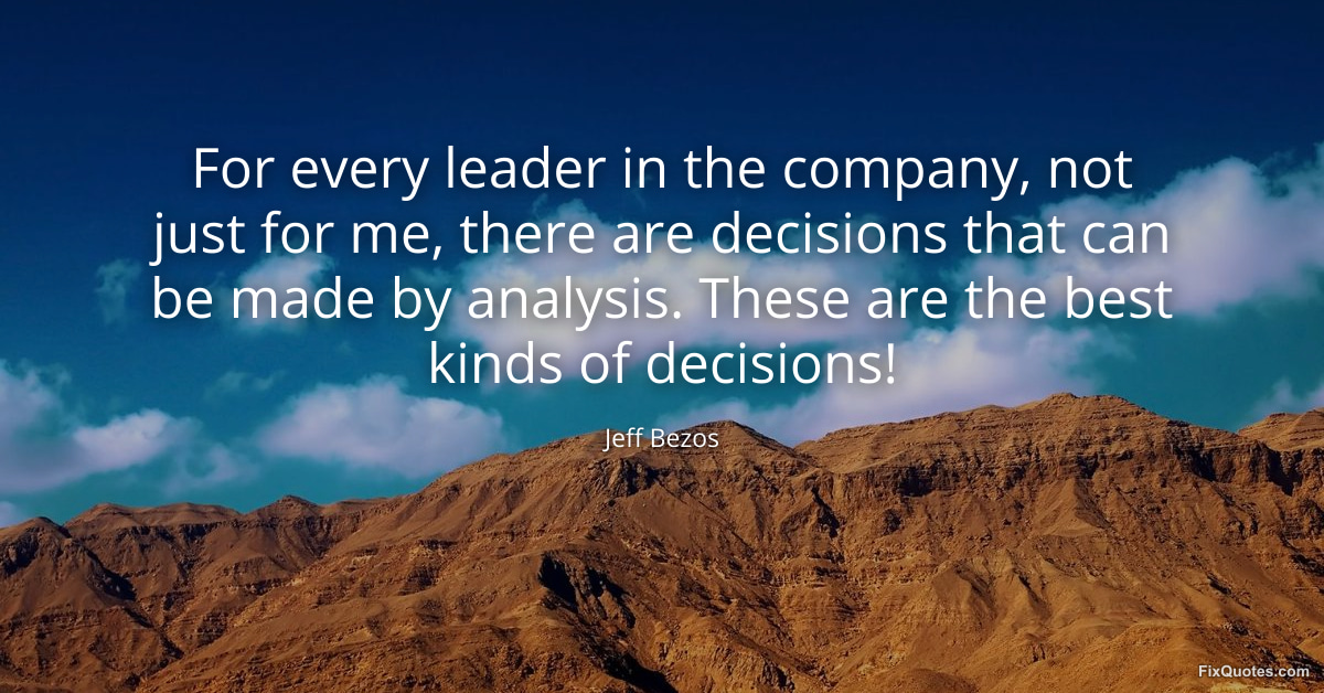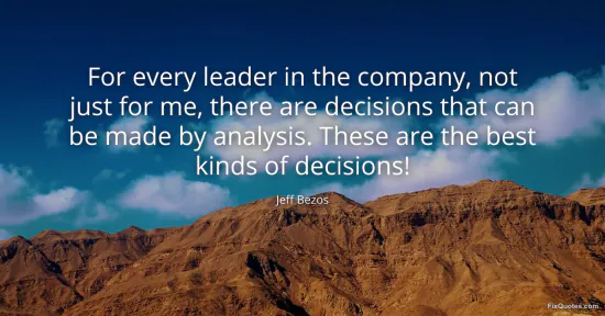 Bezos, Jeff. "For every leader in the company, not just for me, there are decisions that can be made by analysis. These are the best kinds of decisions!" FixQuotes. March 25, 2026. https://fixquotes.com/quotes/for-every-leader-in-the-company-not-just-for-me-186418/.